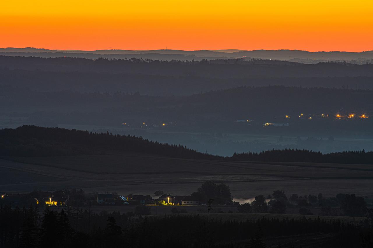 Zleva jsou vidět Dlouhé stráně, vysílač Praděd a vpravo od něj je Vysoká hole (vidět i Petrovy kameny). Domy dole jsou z obce Chlístov. Autor fotografie: Richard Ježík