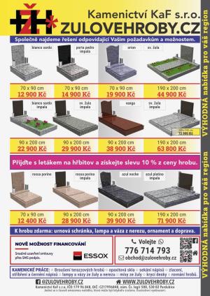 V úterý 4. a 11. 3. v 10:30 – 10:50 bude na hřbitově v Předíně obchodní zástupce Kamenictví KaF s.r.o. a Žulovéhroby.cz přijímat objednávky k opravám hrobů. Poskytujeme veškeré kamenické práce. Využijte výhodných cen na začátku kamenické sezóny.