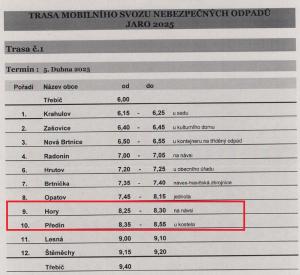Hory: 8:25 - 8:30 na návsi Předín: 8:35 - 8:55 u kostela