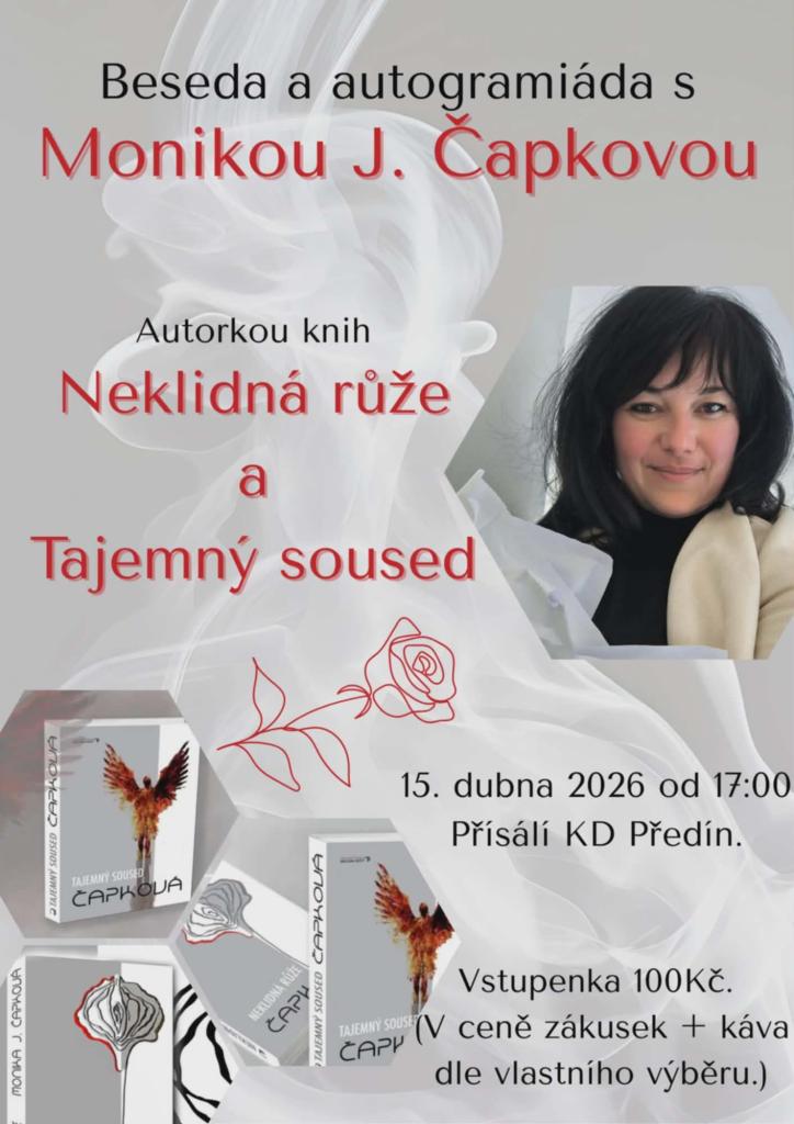 Tuto středu 15.04.2026 v přísálí KD Předín od 17 hodin, vstupné 100,-Kč (v ceně zákusek a káva). Jste srdečně zváni.