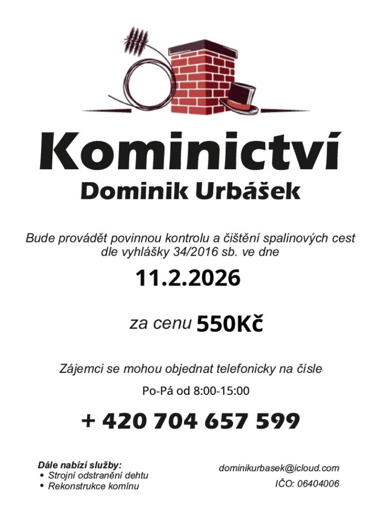 Kominictví Urbášek bude v naší obci dne 11.2.2026 provádět povinnou, každoroční kontrolu a čištění komínů a spalinových cest, od spotřebičů na pevná a plynná paliva.