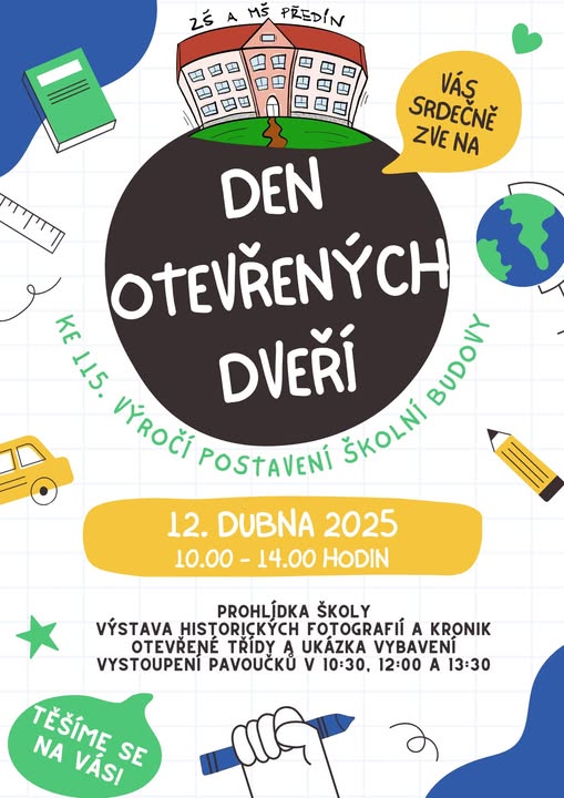 Základní škola a Mateřská škola Předín zve na den otevřených dveří v sobotu 12. dubna 2025 od 10 do 14 hodin.