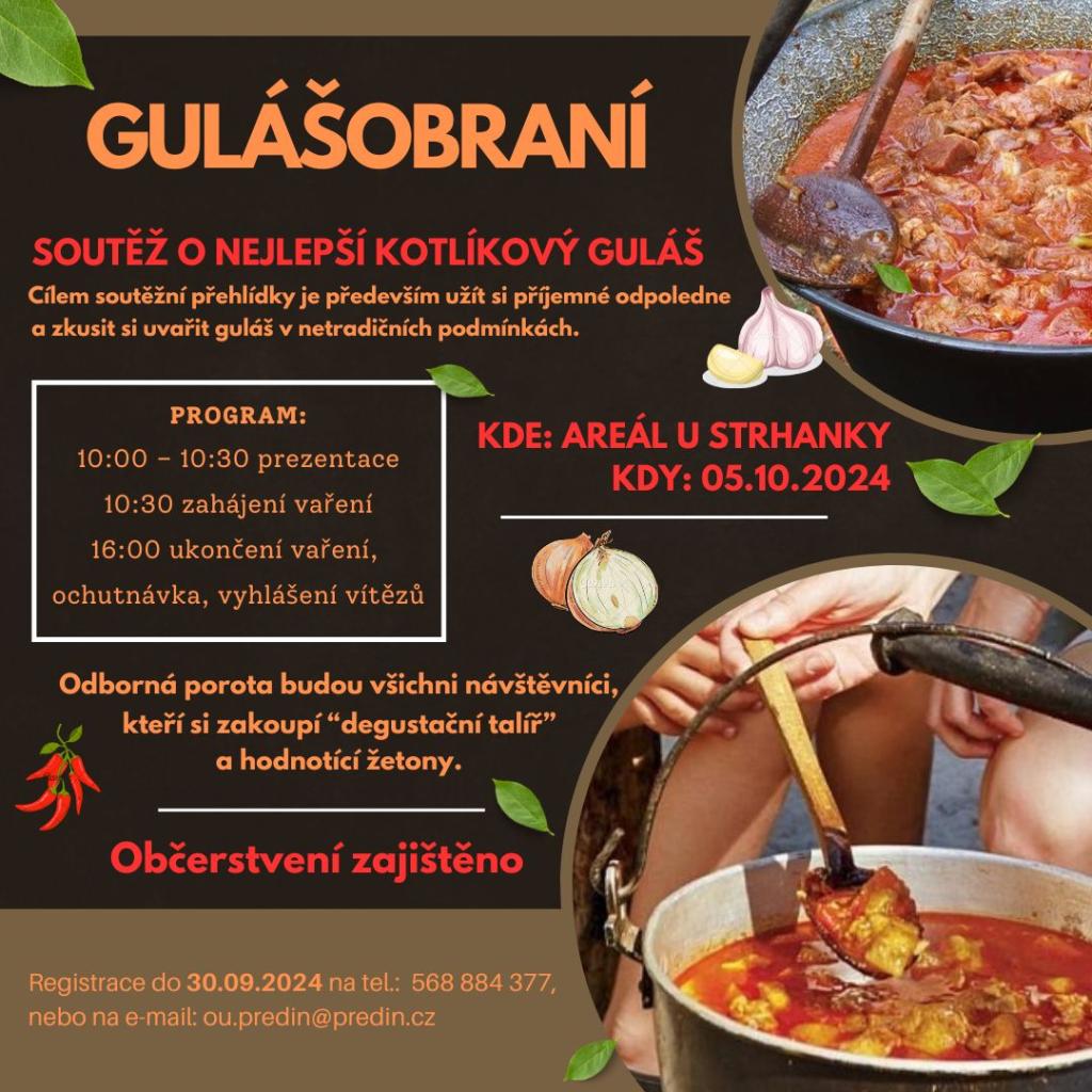 Obec Předín srdečně zve již tuto sobotu 05.10.2024 do areálu u Strhanky na Gulášobraní. Ochutnávky od 16 hodin.