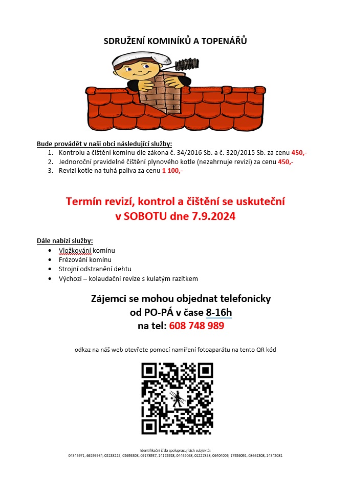 Termín revizí, kontrol a čištění se uskuteční v SOBOTU dne 7.9.2024 TOPENÁŘSKÝ SERVIS s.r.o Malá Morávka 287, 793 36 IČO: 04346971 tel: 608 748 989 https://kominictvi-a-topenarstvi.webnode.cz