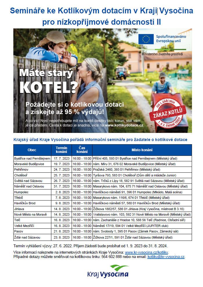 Ve všech obcích s rozšířenou působností v Kraji Vysočina se proto uskuteční semináře jejichž cílem bude poskytnout základní informace o možnostech získání dotací pro nízkopříjmové domácnosti.