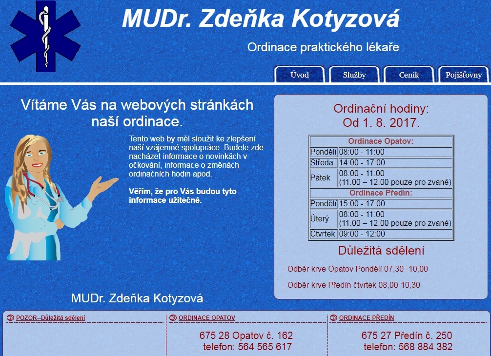 MUDr. Kotyzová oznamuje, že příští týden 6.5.-10.5.2024 neordinuje, akutní případy ošetří MUDr. Lojdová ve Starči po předešlé telefonní domluvě 563 033 075.