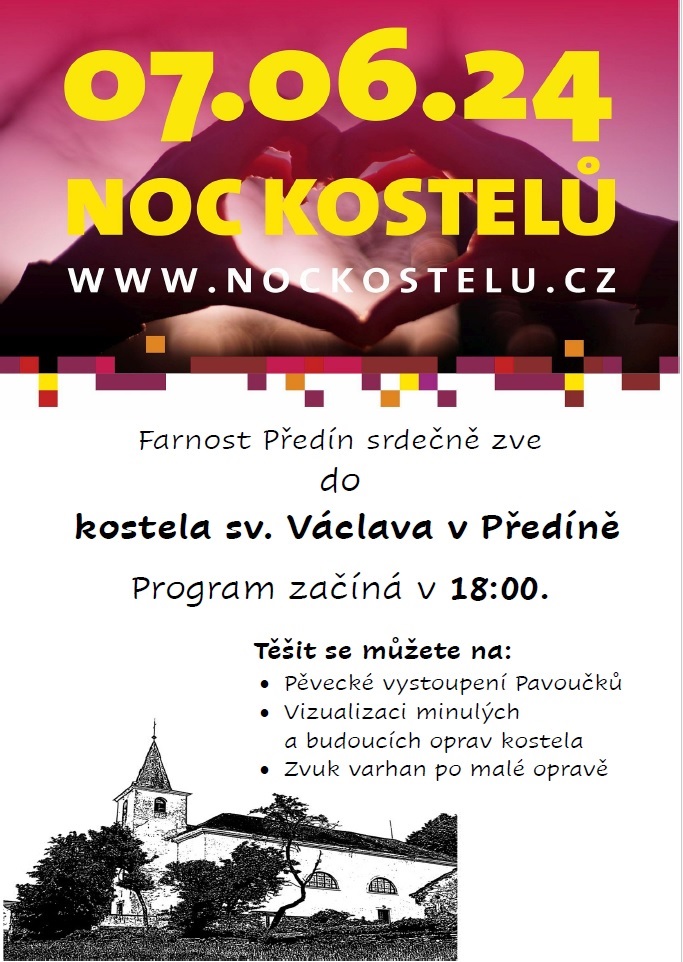 Farnost Předín srdečně zve do kostela sv. Václava v Předíně Program začíná v 18:00. Těšit se můžete na: · Pěvecké vystoupení Pavoučků · Vizualizaci minulých a budoucích oprav kostela · Zvuk varhan po malé opravě