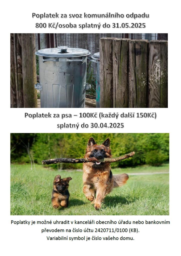 Poplatek za svoz komunálního odpadu 800,- Kč/osoba splatný do 31.05.2025.