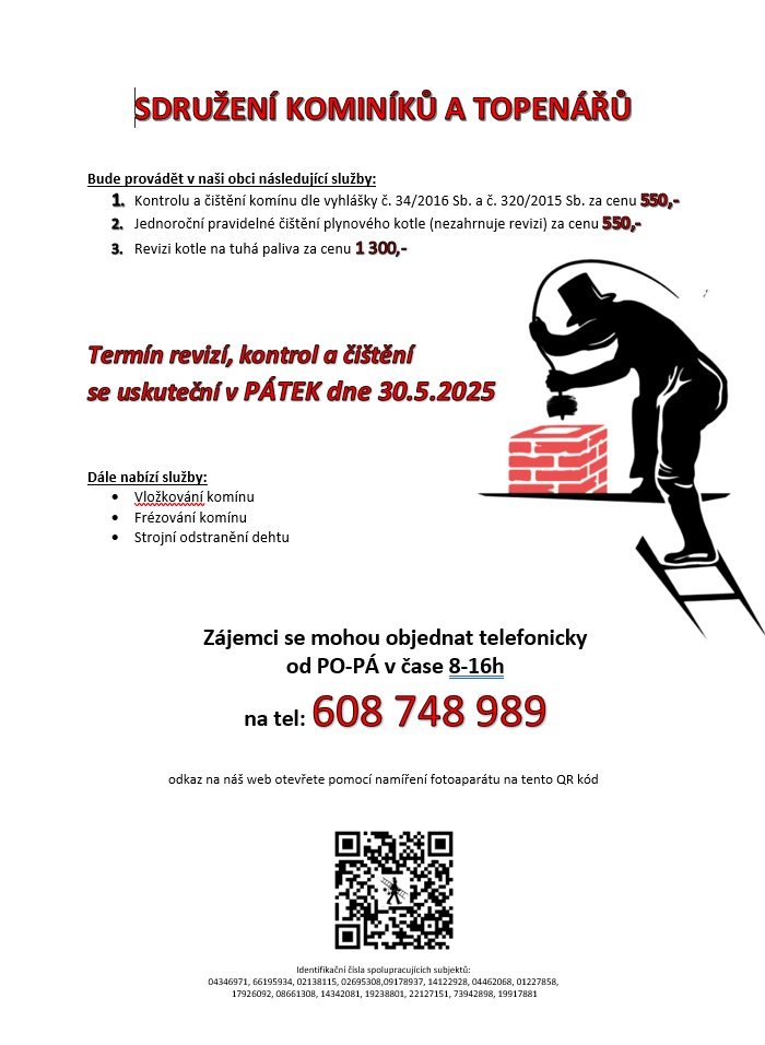 Termín revizí, kontrol a čištění se uskuteční v PÁTEK dne 30.5.2025