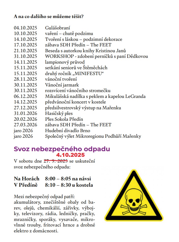 Ve zpravodaji došlo k tiskové chybě. Svoz nebezpečného odpadu bude 4.10.2025, Hory 8:00-8:05 na návsi, Předín 8:10-8:30 u kostela.