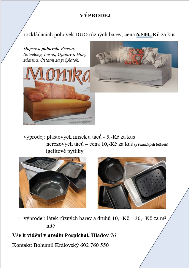 Doprava pohovek: Předín, Štěměchy, Lesná, Opatov a Hory zdarma. Ostatní obce příplatek. Kontakt: Bohumil Královský 602 760 550