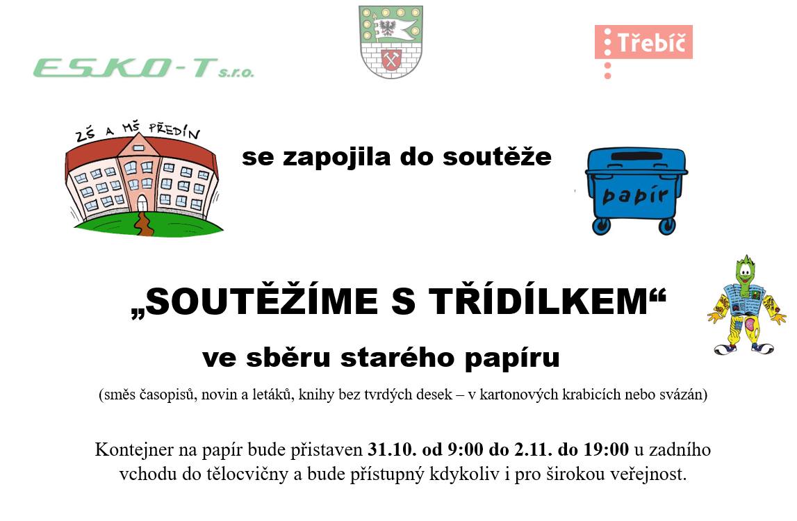 "SOUTĚŽÍME S TŘÍDÍLKEM" ve sběru starého papíru Kontejner na papír bude přistaven 31.10. od 9:00 do 02.11. do 19:00 u zadního vchodu do tělocvičny a bude přístupný kdykoliv i pro širokou veřejnost.